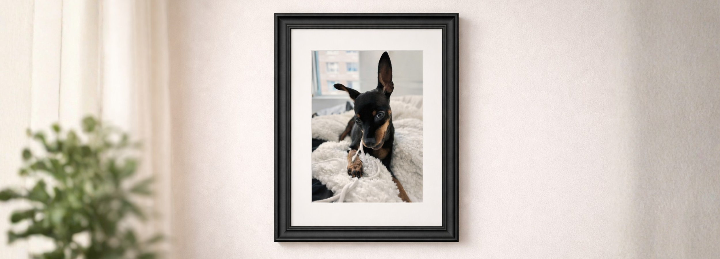 Upload a clear photo of your dog, and we transform it into a museum-grade portrait. Your image is professionally prepared, printed on archival fine art paper, and finished in a handcrafted wood frame with archival matting.